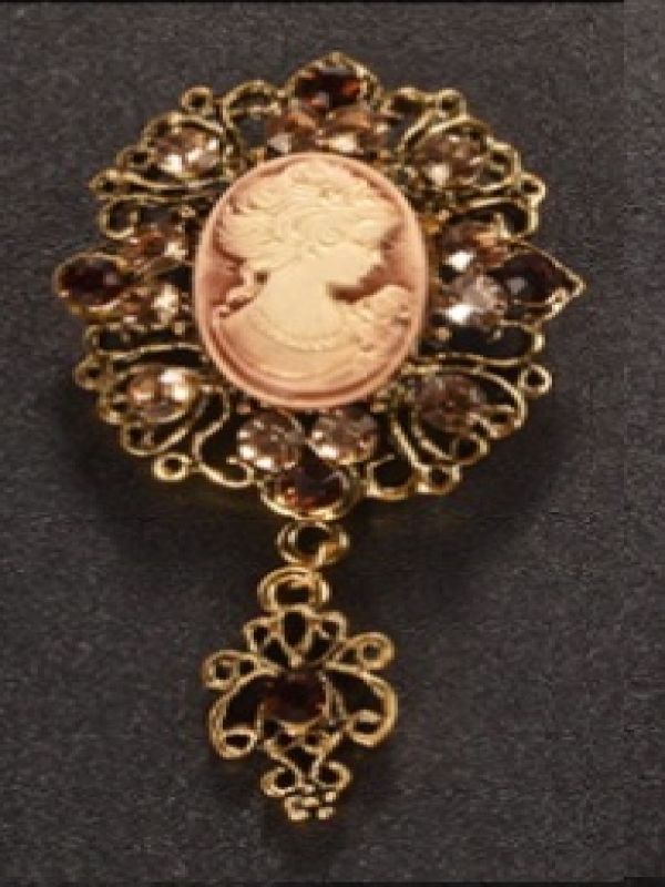 Broche Camée Dorée Pendentif Strass Marron