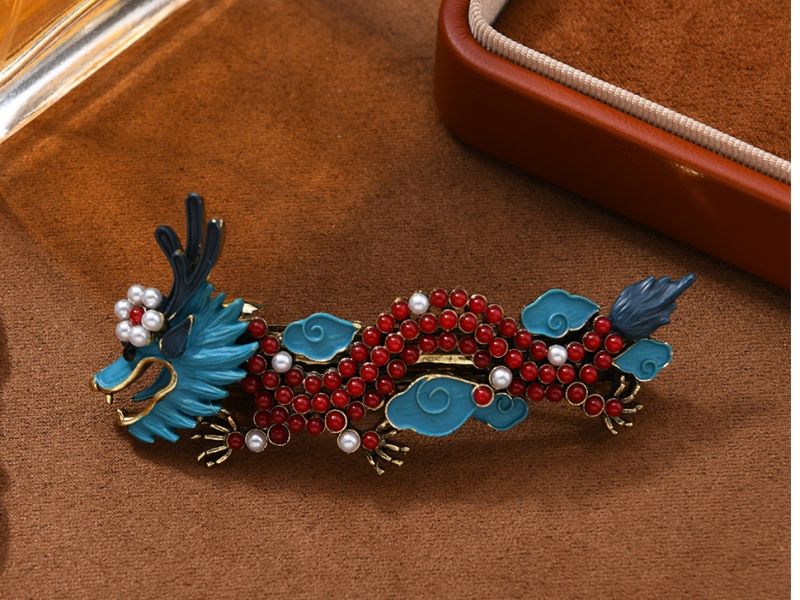 Le cloisonné, une technique remontant à la dynastie Ming, consiste à créer des motifs délicats à l’aide de fils métalliques fins, remplis ensuite d’émaux colorés. Chaque broche est minutieusement travaillée, révélant des motifs floraux, des arabesques délicates ou des symboles porte-bonheur emblématiques de la culture chinoise.